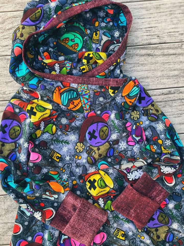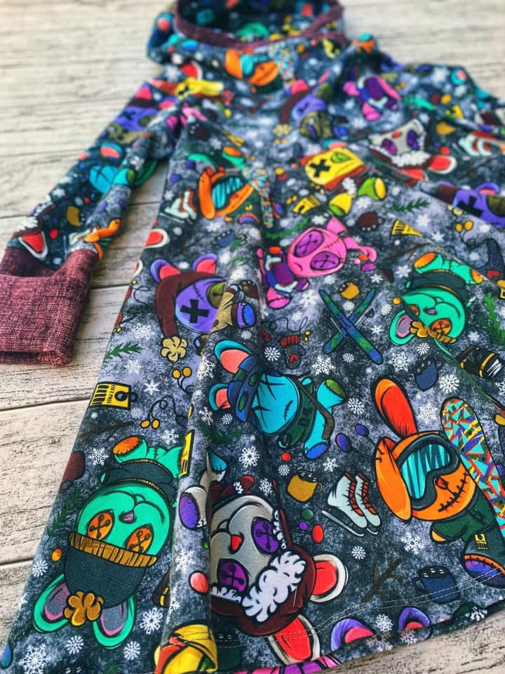 This super cute long sleeve dress features a lined crossover hood, A-line skirt, and extra long cuffed sleeves. Simply adjust the sleeves as they grow! Created with custom printed high quality cotton spandex.