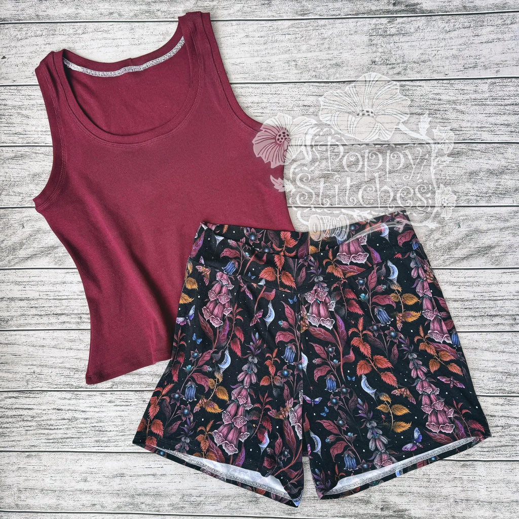 This cozy lounge set features custom printed bamboo spandex shorts, hemmed with a soft knit waistband. The tank is created in a soft organic cotton spandex ribbing. Perfect for lounging and sleeping!