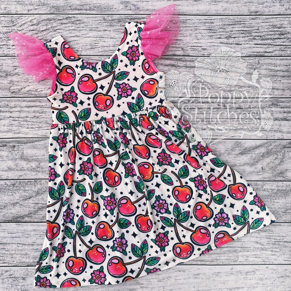 This sleeveless Magnolia Dress features a lined bodice with cross back, a gathered skirt with tulle ruffles at the shoulders. Created with custom printed AM Bamboo Spandex and Tulle.