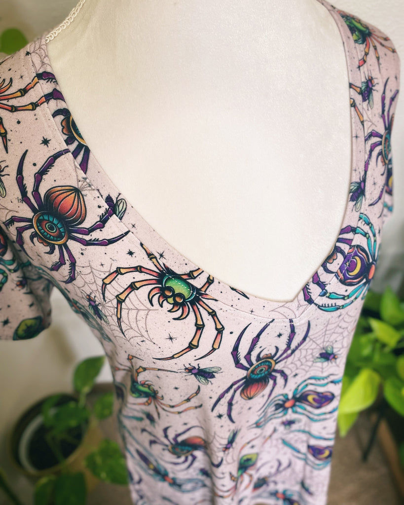 Created with American milled bamboo spandex 260gsm, features a dolman short sleeve, vneck, and curved hem. Semi-fitted at chest and relaxed waist/hip